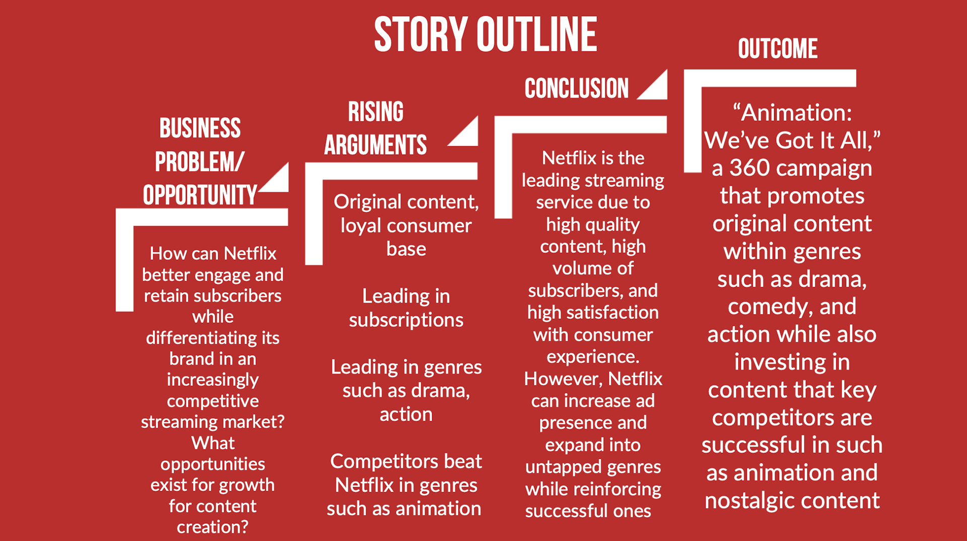 This course explores the intersection of data analysis and storytelling, emphasizing how to transform raw insights into compelling narratives. A key project involved researching Netflix, identifying a business challenge or opportunity, and leveraging Qualtrics software to gather consumer insights. Using this data, we developed a strategic campaign to address the findings, demonstrating the power of data-driven storytelling in marketing and business decision-making. All work shown is original and was created for academic purposes only. I am not affiliated with the brands featured.